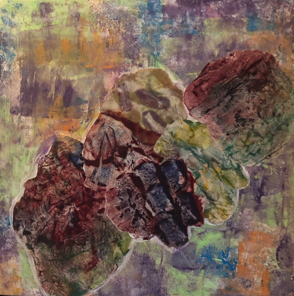 REMINISCENCES #1 - 2025 16" x 16" LAYERS OF ENCAUSTIC MONOPRINTS, MIXED MEDIA ON BOARD IN FLOATING FRAME