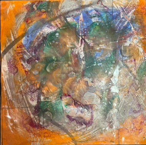 METEOR- 2024 16” x 16” Oil, cold wax, painted fabric